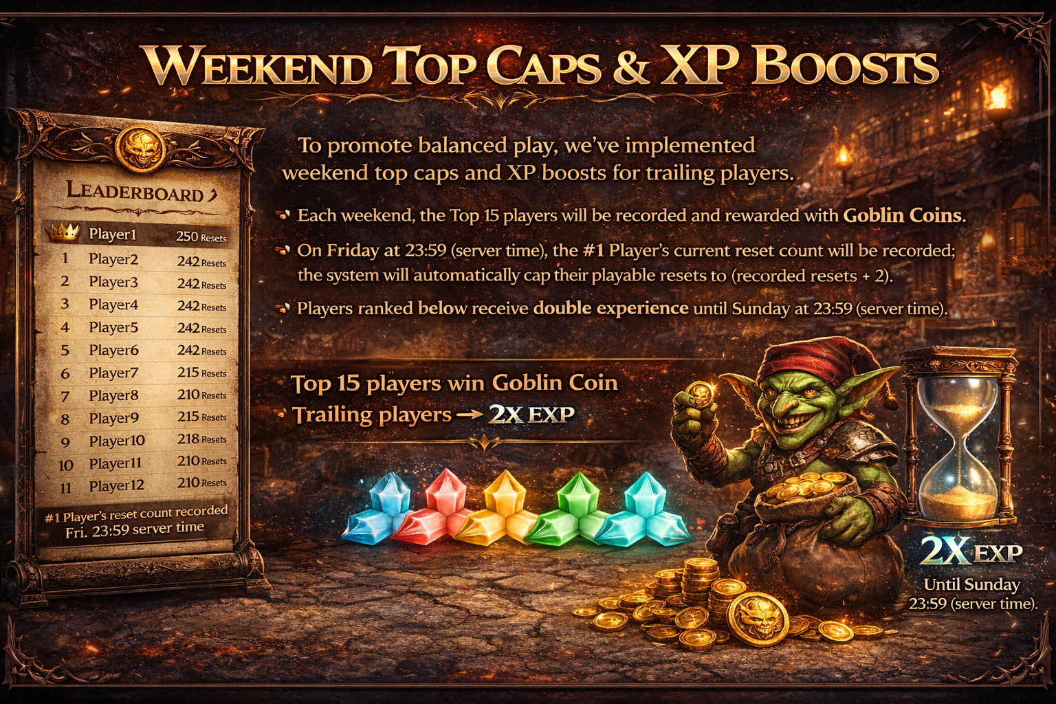 Each weekend, the Top 15 players will be recorded and rewarded with Goblin Coin. This currency can be used to purchase consumables in the xShop as well as Blaze Crystals in the Shop.